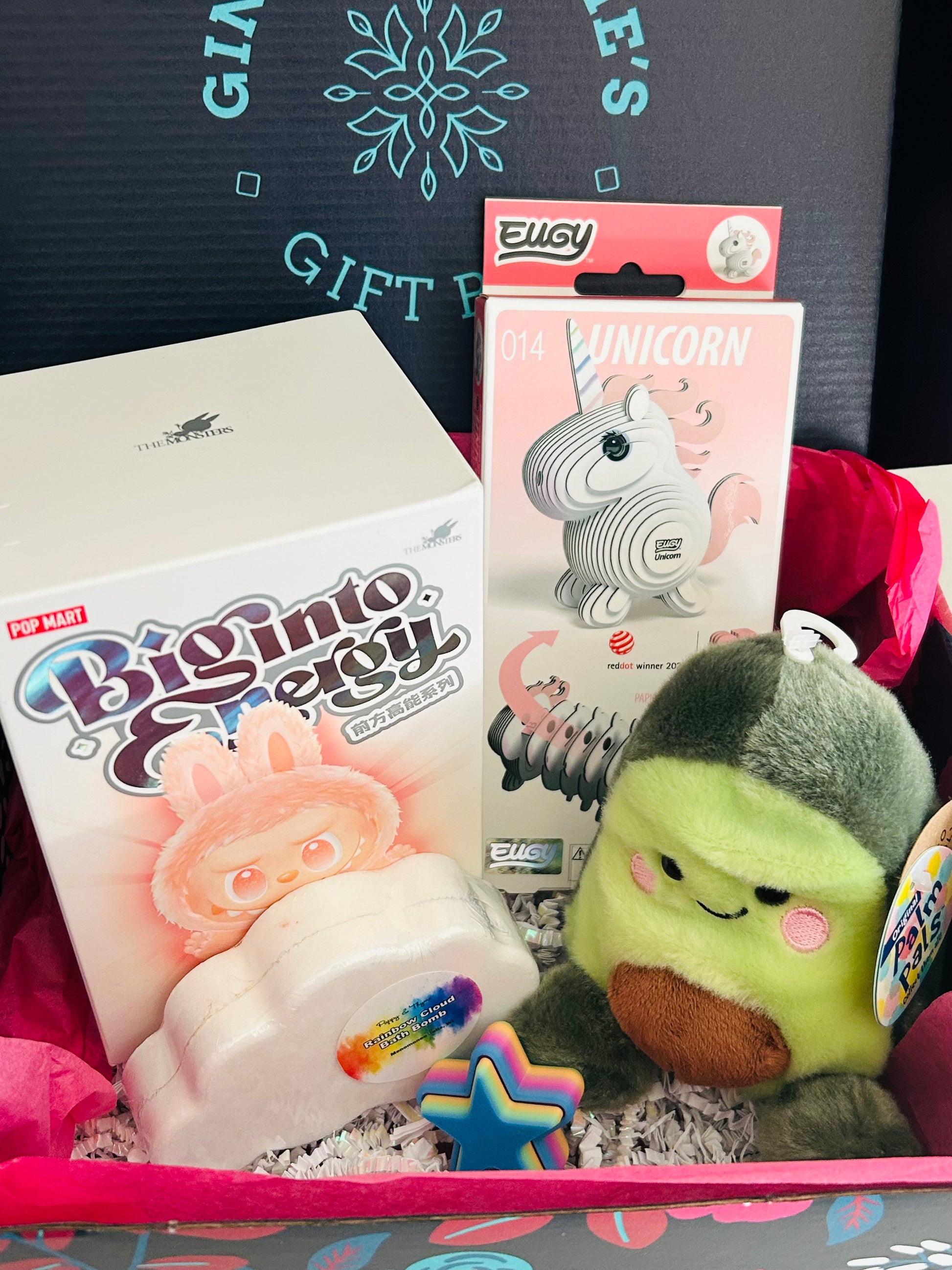 Includes: Popmart’s Labubu, Eugy unicorn 3D puzzle, Avocado Palm Pal, 3D printed fidget clicker, and Rainbow bath bomb.